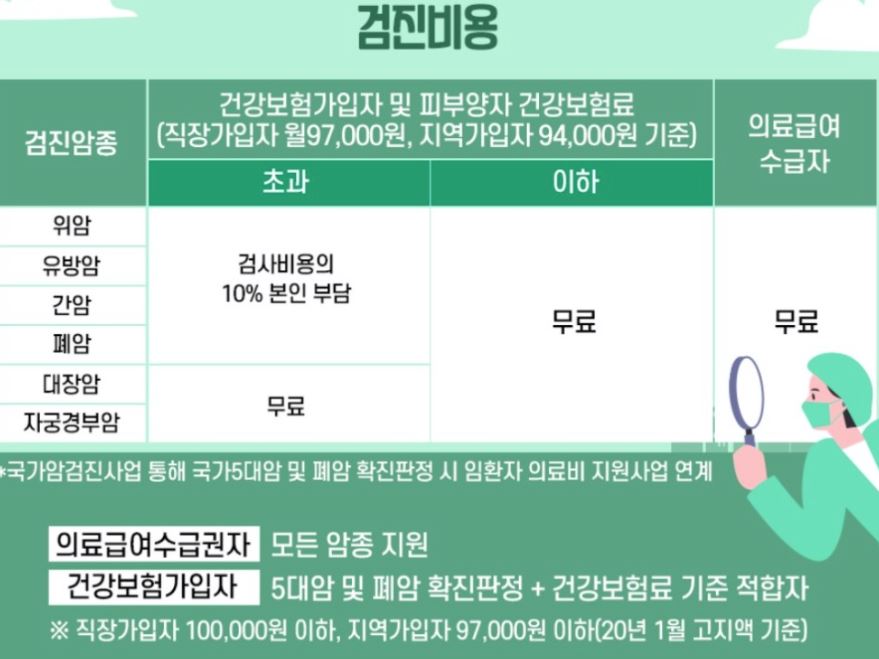 암건진 대상자는 위암(만 40세 이상), 유방암(만 40세 이상 여성), 자궁경부암(만 20세 이상 여성), 간암(만 40세 이상 중 발생 고위험군), 대장암(만 50세 이상), 폐암(만 54~74세 중 고위험군)이다. 암검진 연령기준, 검진주기 및 검진 비용은 아래를 참고하자.